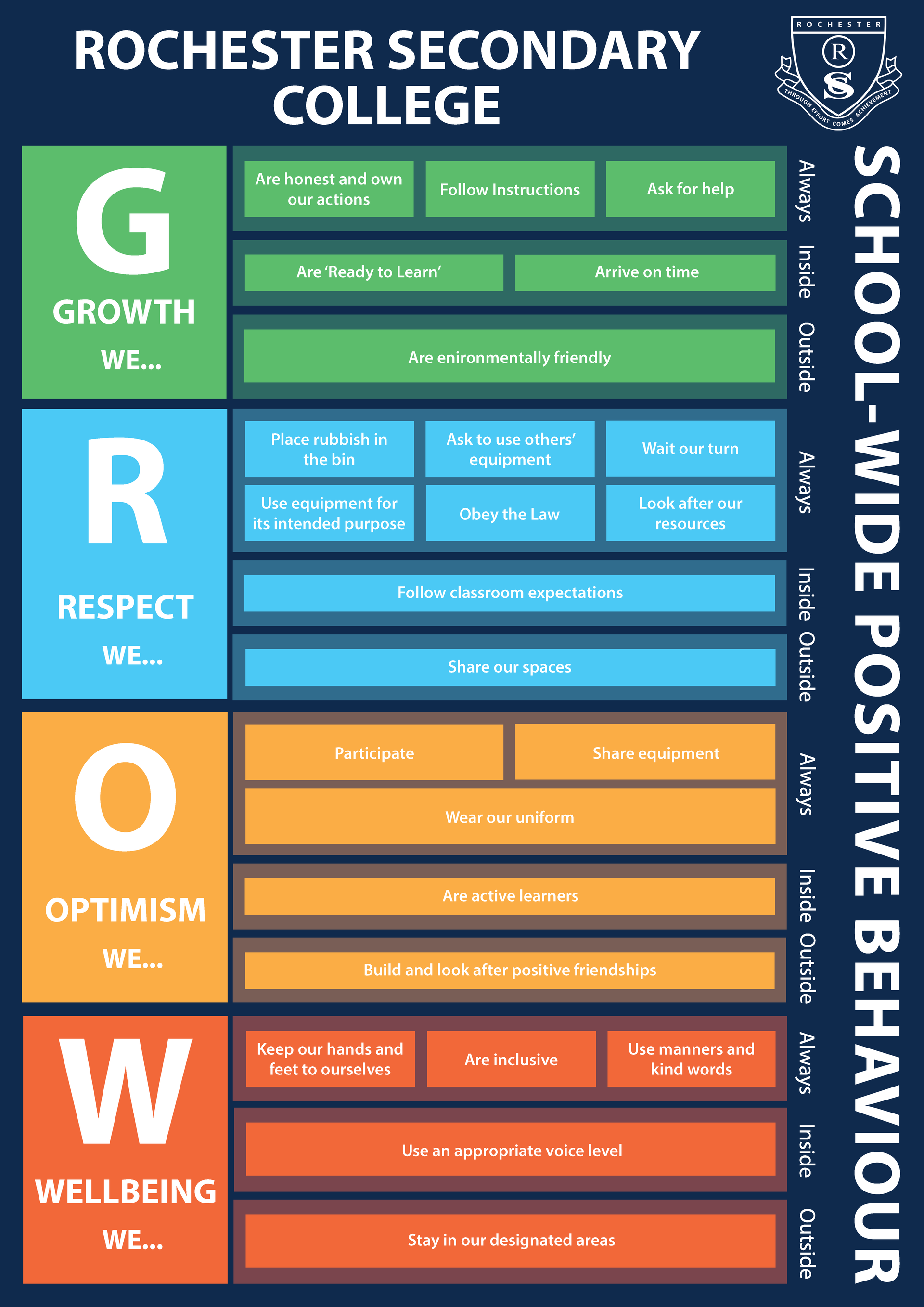 At Rochester Secondary College (RSC), we are committed to fostering a safe, respectful and supportive learning environment where every student can thrive. A key part of this commitment is our implementation of School-Wide Positive Behaviour Support (SWPBS).